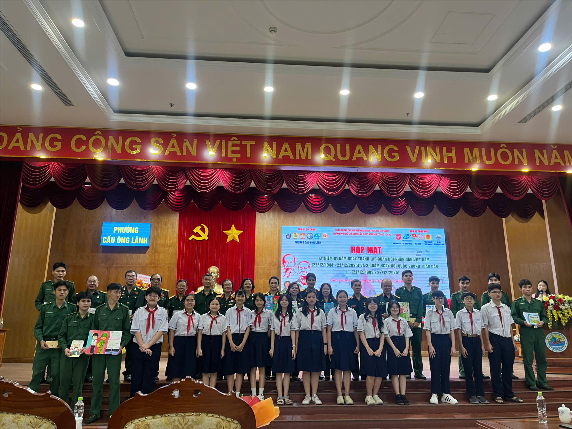 🔹 Bên cạnh đó, Đoàn – Đội trường còn tổ chức đến thăm và tặng quà cho Ban Chỉ huy Quân sự phường Cầu Ông Lãnh, thể hiện sự tri ân sâu sắc và tình cảm kính trọng của thầy trò nhà trường đối với lực lượng vũ trang địa phương.