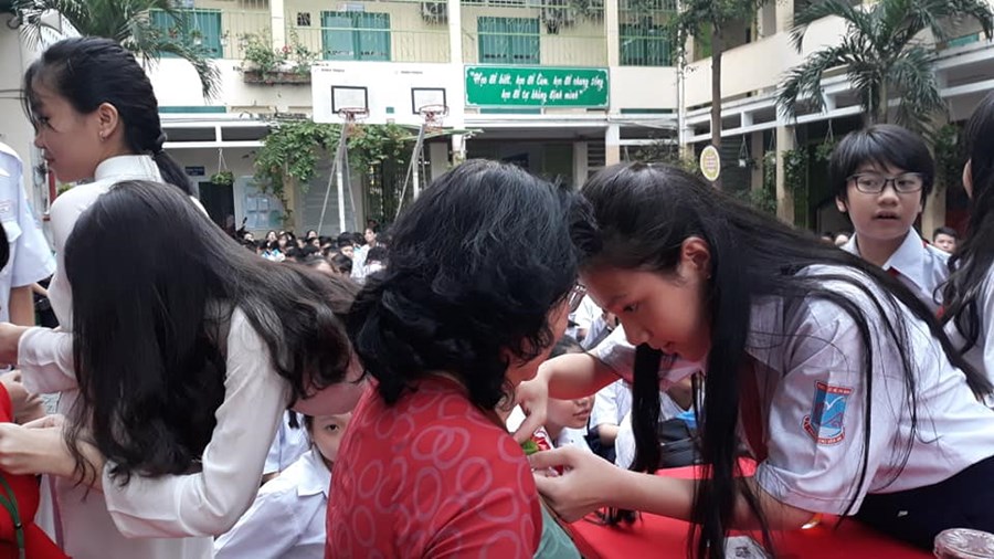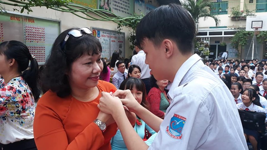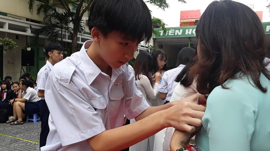 Học sinh cài hoa cho Cô Minh Xuân - Phó Hiệu trưởng nhà trường để tri ân nhân ngày 20/11.