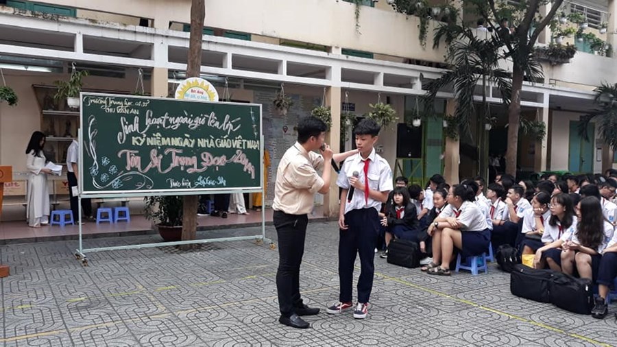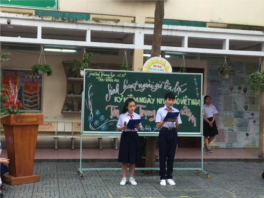 Sáng ngày 20/11/2019 trường THCS Chu Văn An đã tổ chức tiết sinh hoạt ngoài giờ lên lớp kỷ niệm Ngày Nhà Giáo Việt Nam 20/11, với chủ đề : "Tôn Sư Trọng Đạo". Chương trình được thực hiện bởi lớp 6A6 và lớp 9A8, buổi sinh hoạt diễn ra đầy vui tươi, sôi nổi và hào hứng, dưới đây là một số hình ảnh của buổi sinh hoạt.