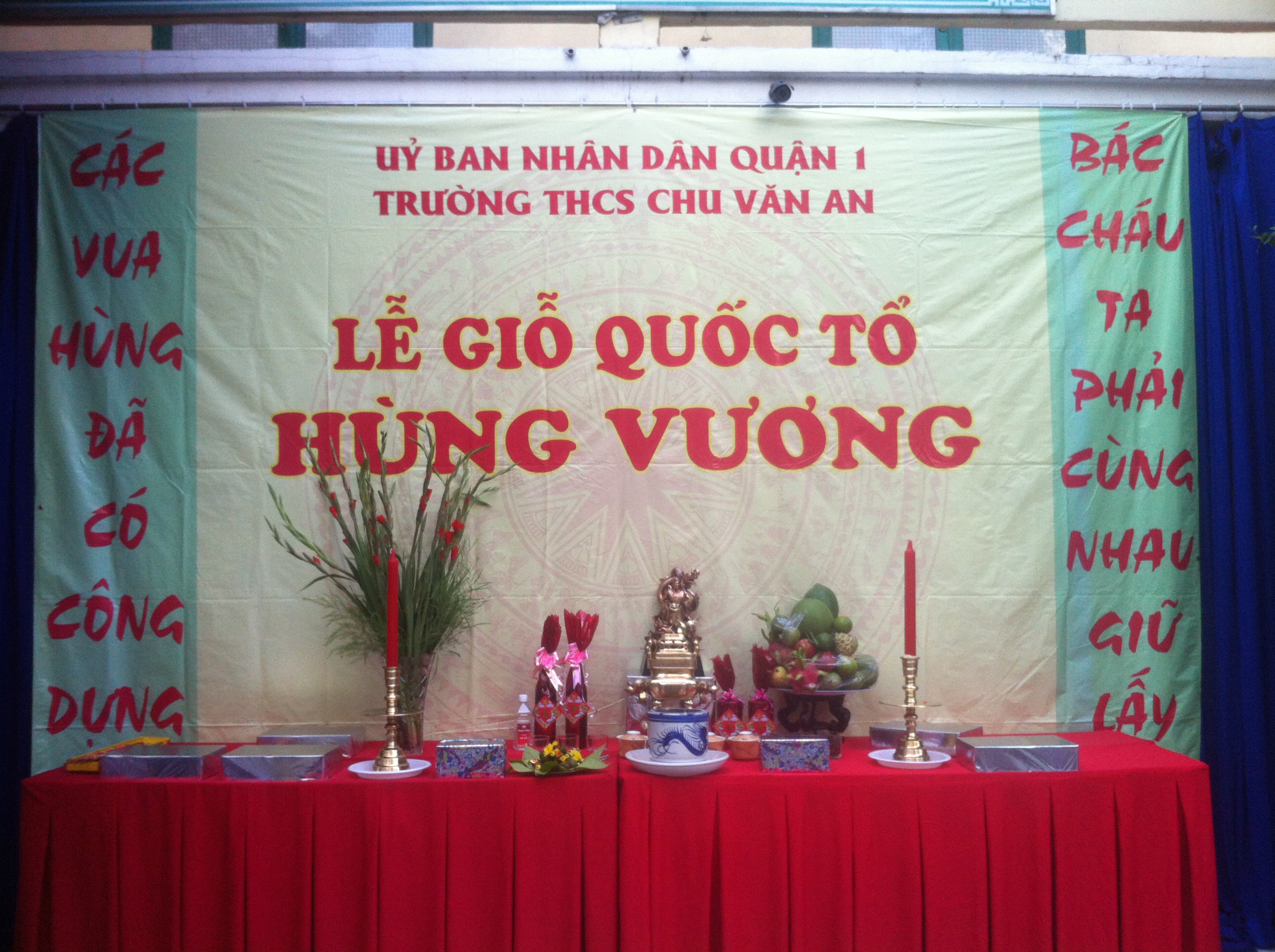 Các em học sinh dâng lễ vật lên bàn thờ quốc Tổ.